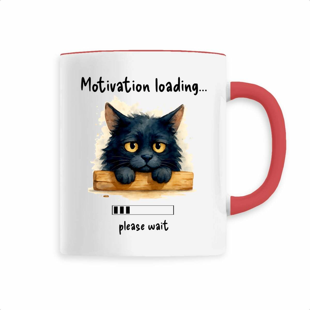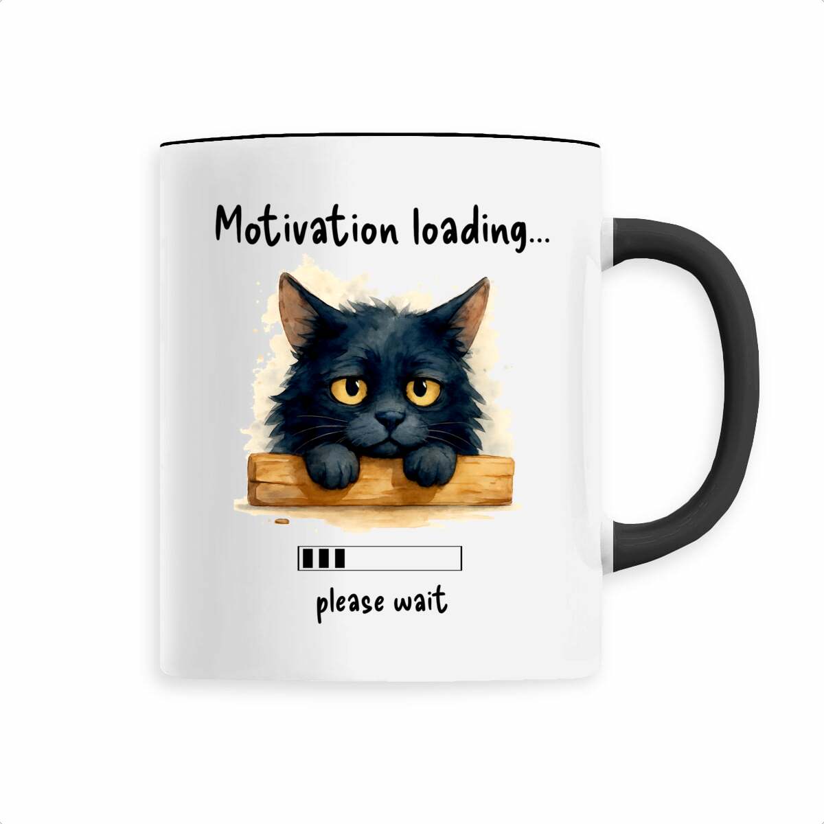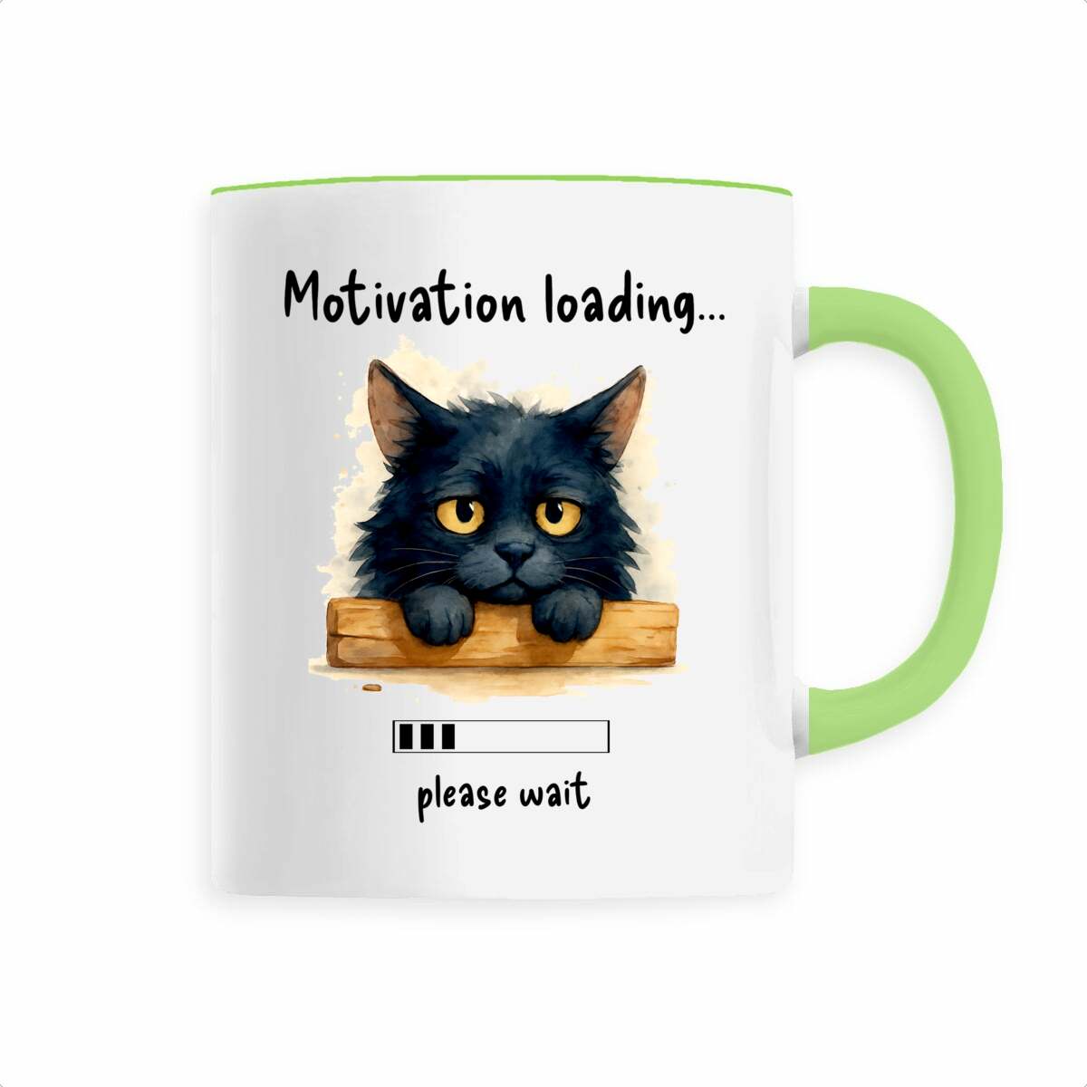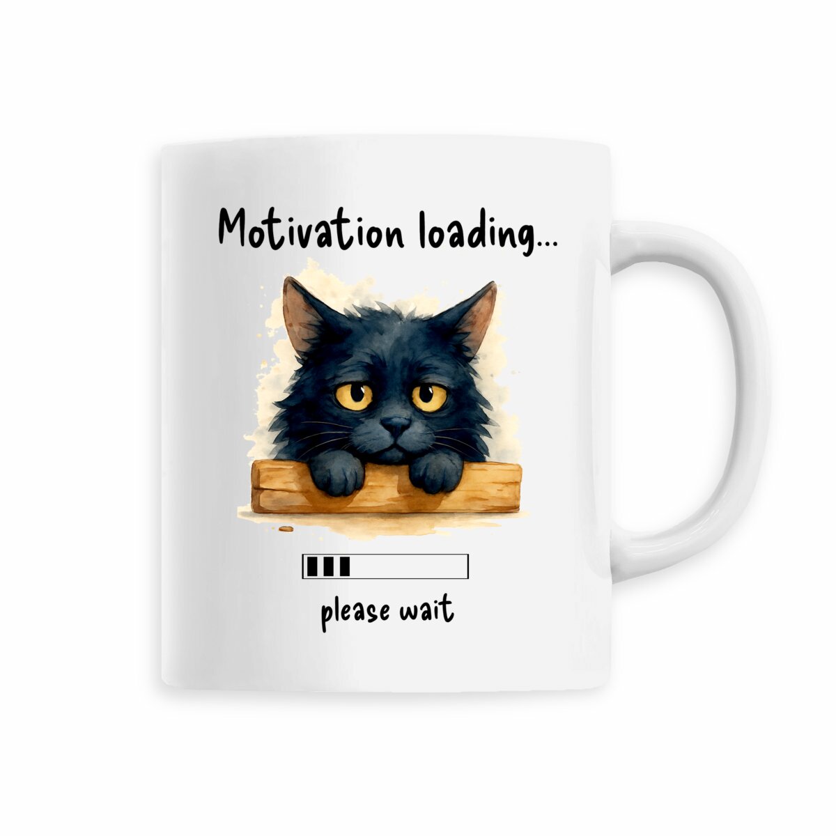 Ceramic mug printed with hand-painted watercolor “Tired Cat” and phrase “Motivation loading… please wait.” Sustainable, dishwasher safe, 330 ml capacity.